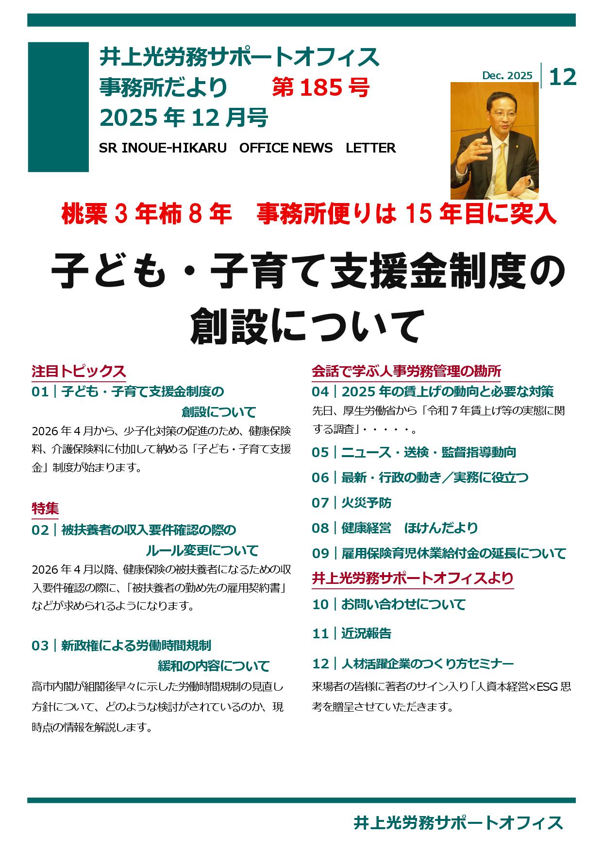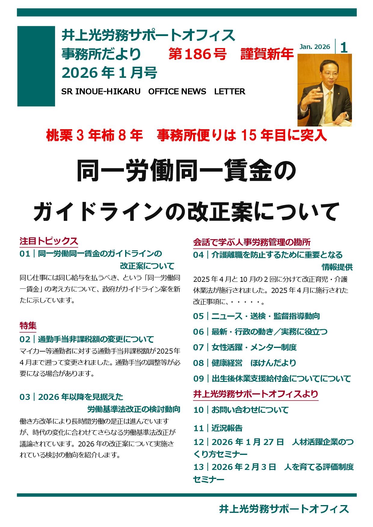 | 01|同一労働同一賃金のガイドラインの改正案について 02|通勤手当非課税額の変更について 03|2026年以降を見据えた労働基準法改正の検討動向 04|介護離職を防止するために重要となる情報提供 05|ニュース・送検・監督指導動向 06|最新・行政の動き/実務に役立つ Q&A 07|女性活躍・メンター制度 08|健康経営 ほけんだより 09|出生後休業支援給付金についてについて 10|お問い合わせについて 11|近況報告 12|2026年1月27日(火) 人材活躍企業のつくり方セミナー 13|2026年2月3日(火) 人を育てる評価制度セミナー |